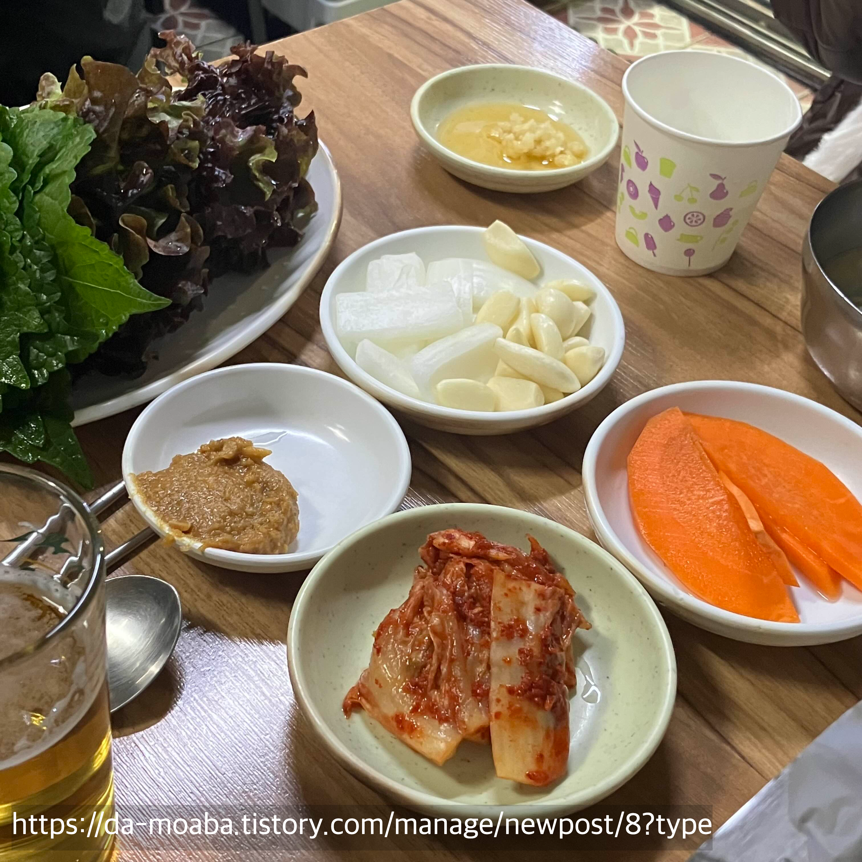 그러면 당근, 김치, 마늘, 된장, 쌈채소, 양념장이 나온다.